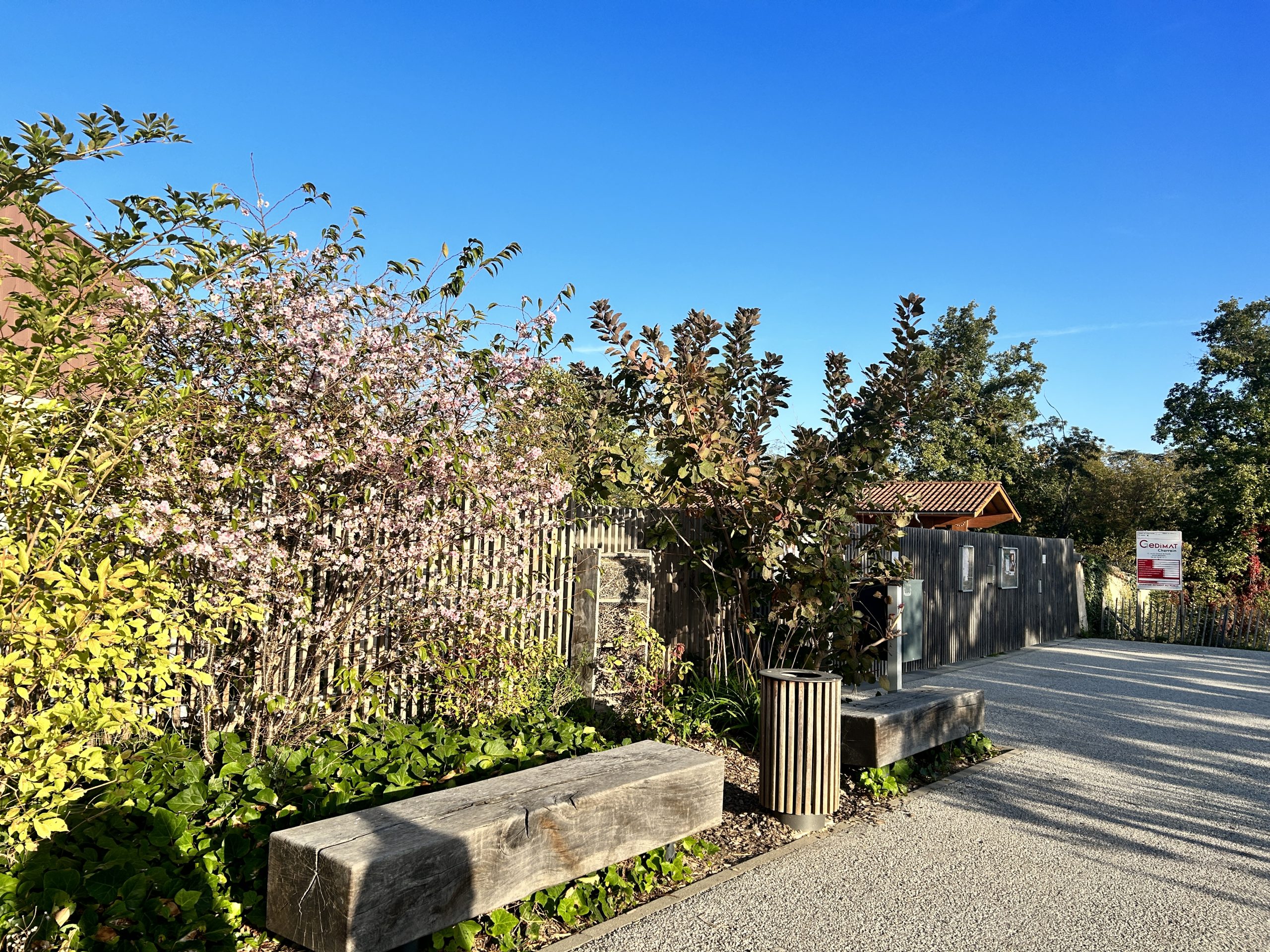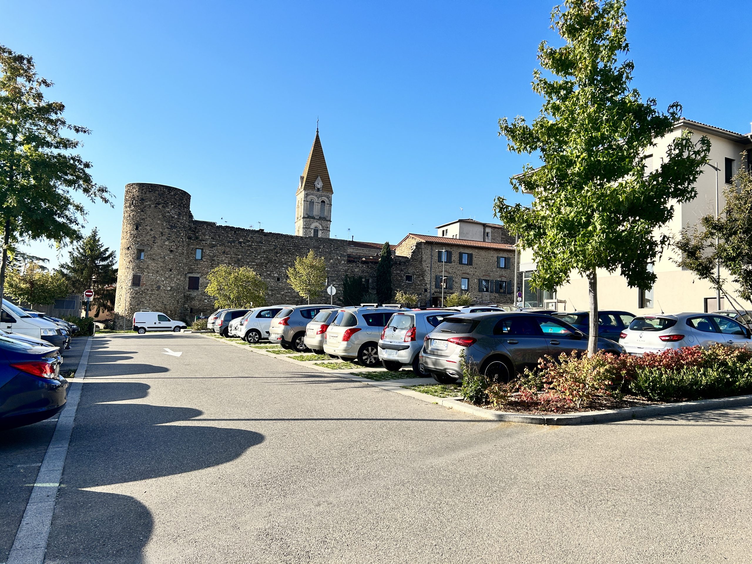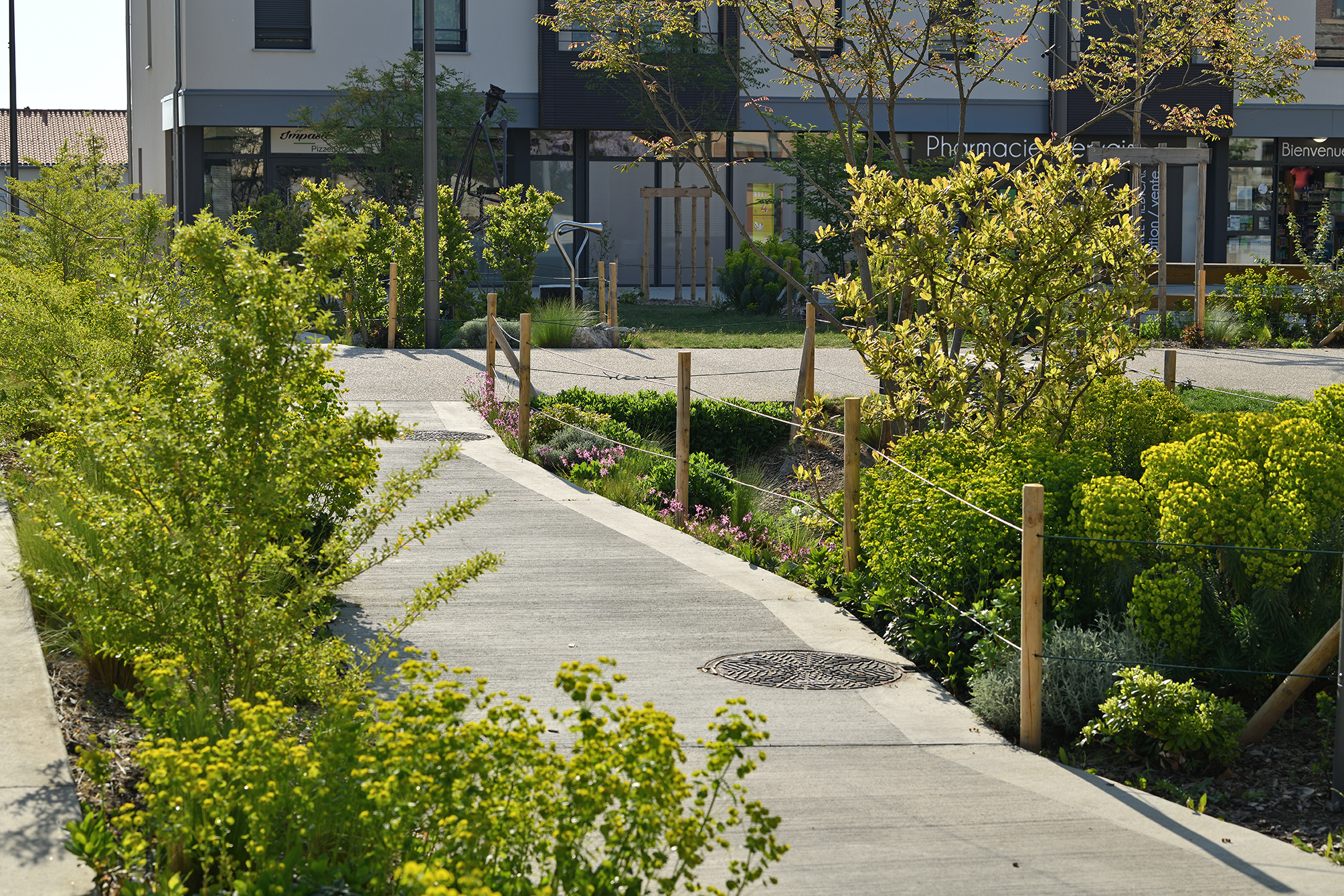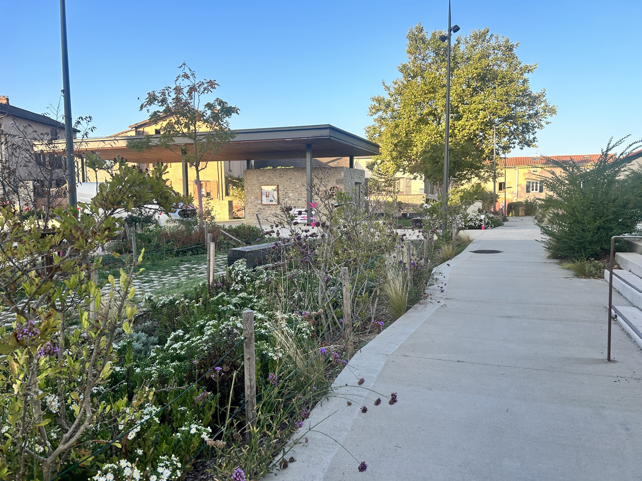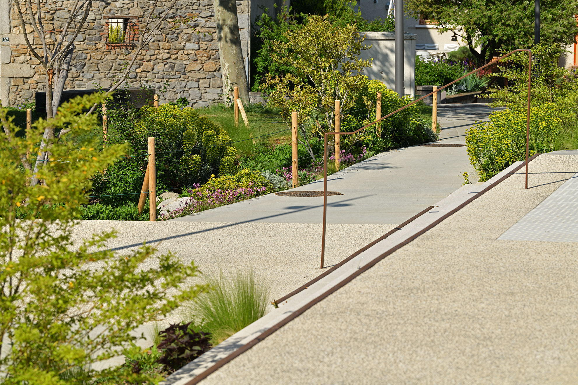 __ La place du piéton : Dans notre conception du projet, nous nous sommes préoccupés des parcours piétons entre les différents équipements et espaces publics, désirant créer des ambiances pour chaque cheminement, et en incluant un parcours adapté pour les personnes à mobilité réduite. La reconfiguration du stationnement a permis de libérer de l’espace au profit des piétons et des plantations. Le parking de l’école est mutualisé : dédié à l’équipement en journée, il permet aux riverains du castrum de stationner le soir et les week-ends.