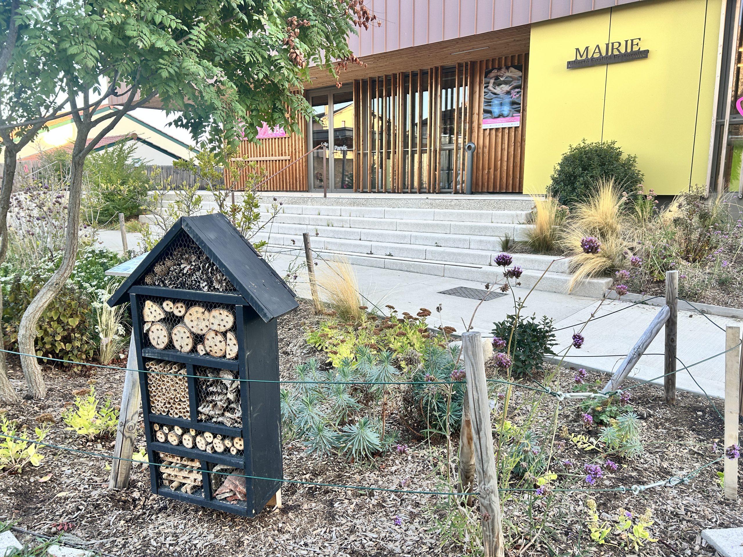 __Les éléments bâtis affirmant des espaces centraux : L’église avec la création d’un parvis, la nouvelle Mairie, construite au-dessus de l’école, dans la perspective de la place de l’église, les futurs commerces et logements qui s’implantent entre la place et les parkings des écoles pour structurer l’espace public.